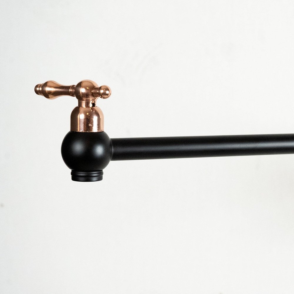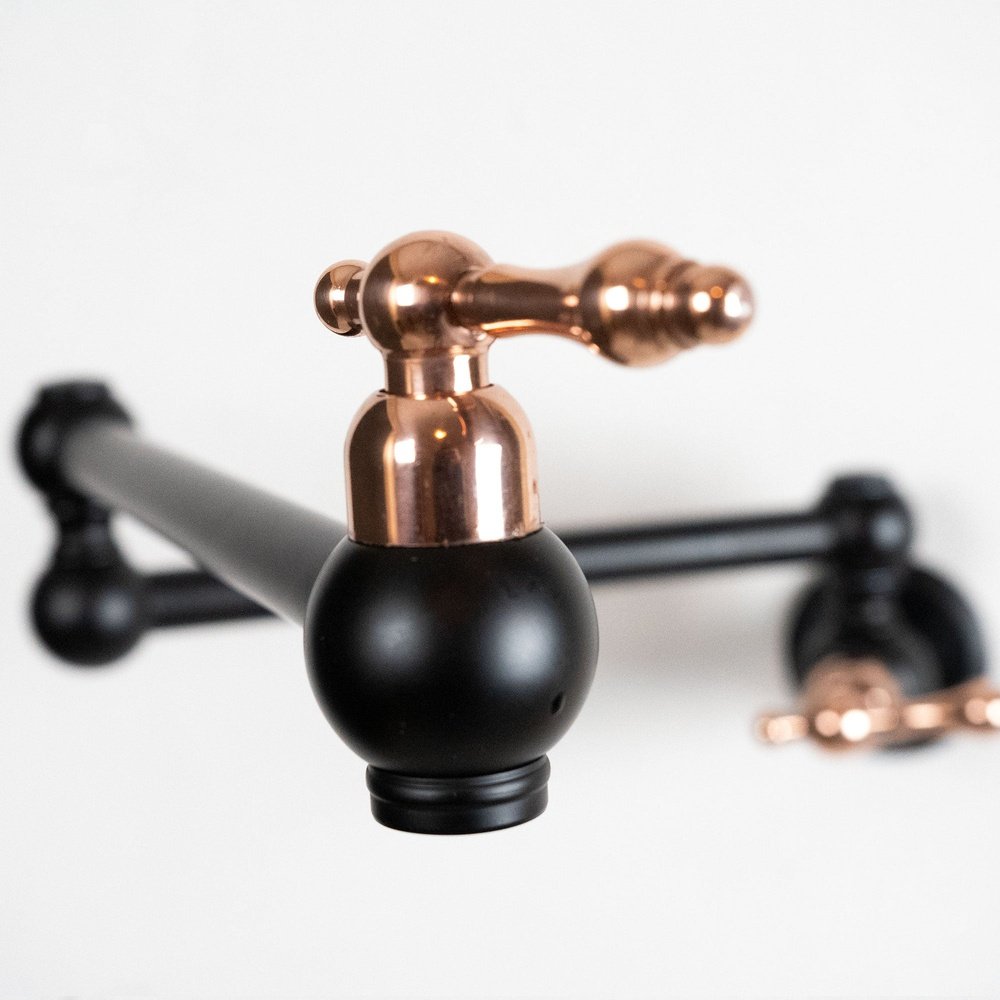 Give your kitchen a modern edge with this black pot filler faucet with copper lever handles.