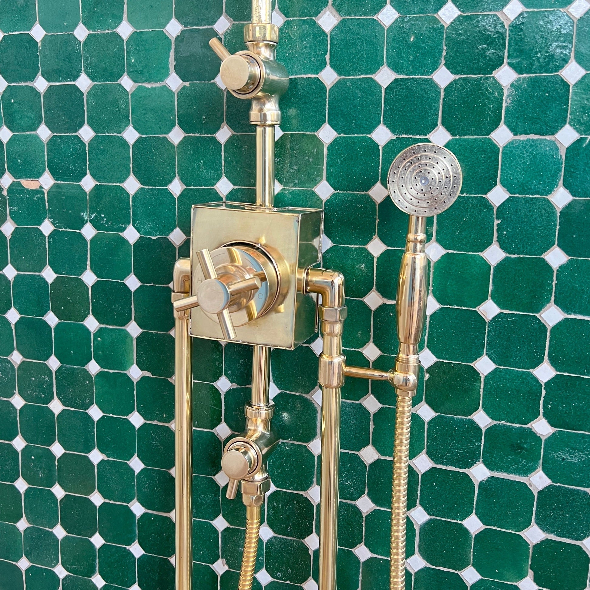 Experience luxurious showering with our thermostatic shower system featuring a handheld sprayer and extra-long legs for flexible installation. Handcrafted from unlacquered brass, this shower offers precise temperature control, added versatility, and a touch of vintage elegance.