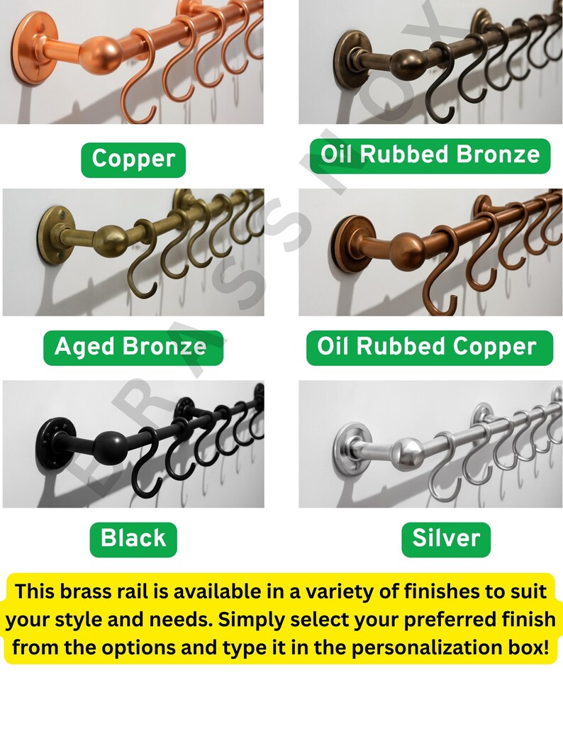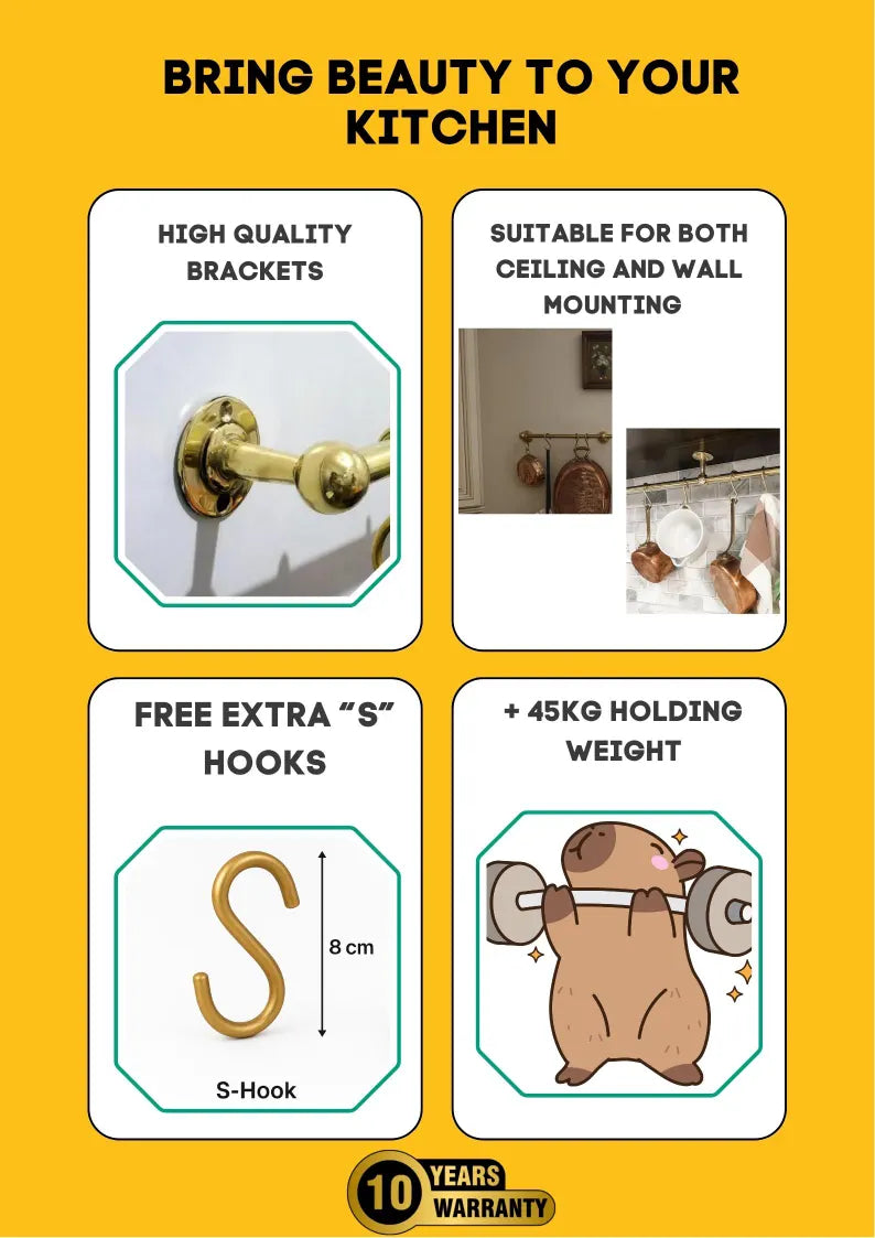 Unlacquered Brass Pot Rail with S Hooks – Antique Style Handmade Gold Brass Pot Rack, Rustic Wall & Ceiling Mounted Vintage Kitchen Storage