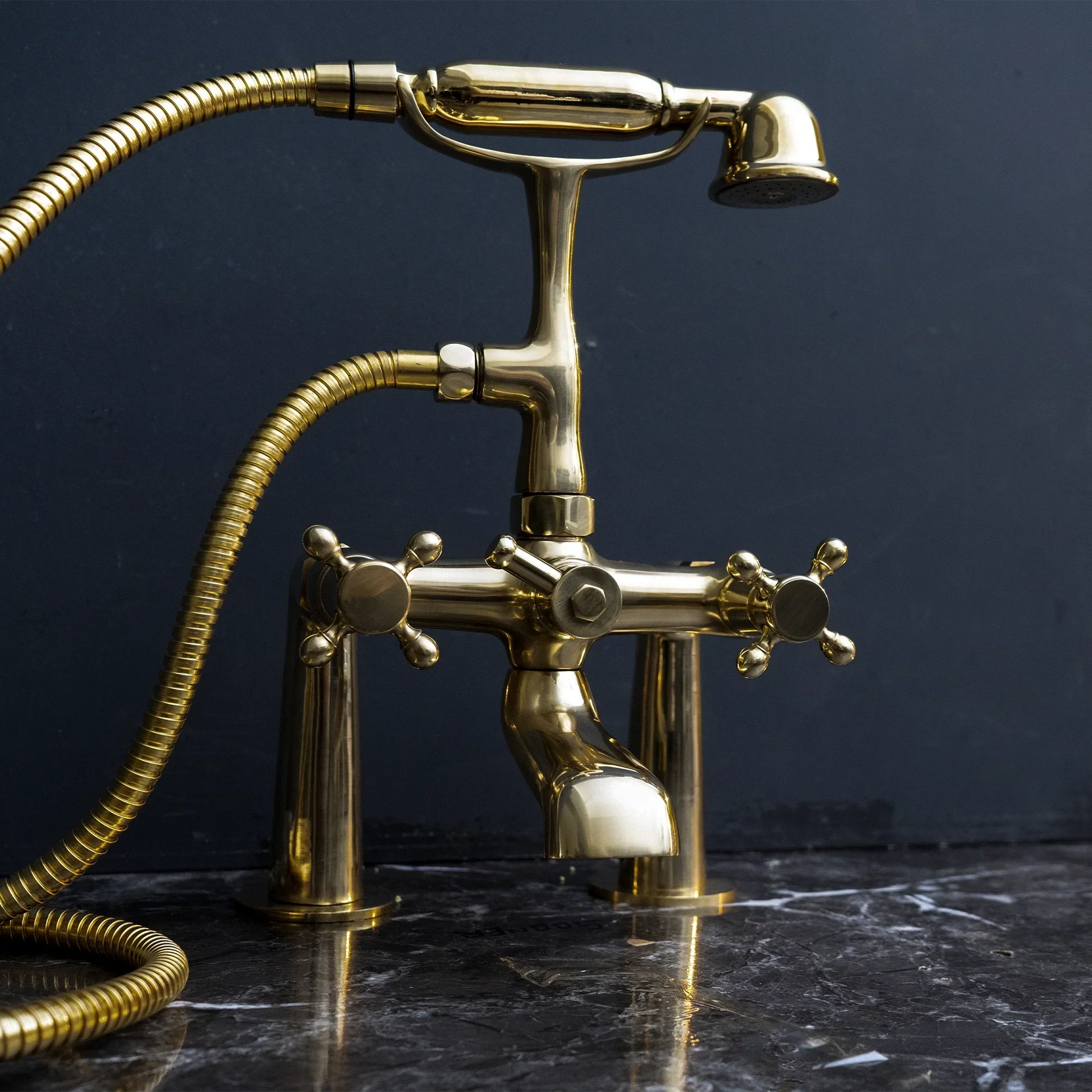 The traditional English-style telephone faucet comes complete with simple cross handles and lever diverter, brass hand shower, and flexible 60" hose,